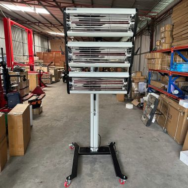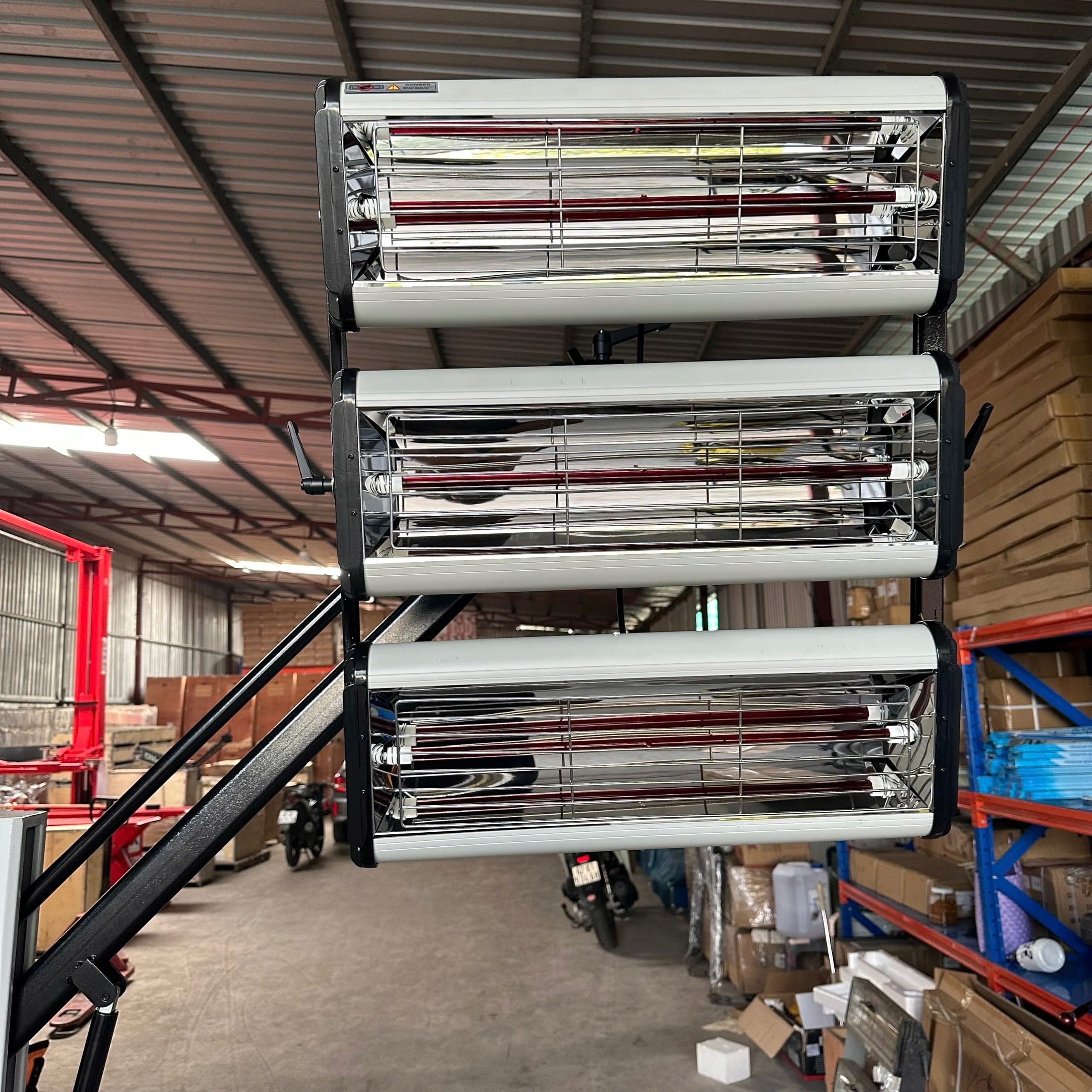 1. Đèn sấy sơn bằng tia hồng ngoại - sóng ngắn 3 bóng F3A:Đèn sấy sơn bằng tia hồng ngoại - sóng ngắn 3 bóng F3A là thiết bị sử dụng công nghệ hồng ngoại sóng ngắn, trang bị 3 bóng đèn công suất tổng 3 kW, vận hành trên nguồn điện 1 pha. Thiết kế linh hoạt với chiều cao bảng đèn lớn điều chỉnh từ 400 mm đến 2500 mm, phù hợp mọi kích thước chi tiết cần sơn. Nhiệt độ đầu ra điều chỉnh từ 0 – 100 °C giúp làm khô lớp sơn nhanh chóng, đồng đều, tăng năng suất và chất lượng hoàn thiện bề mặt.